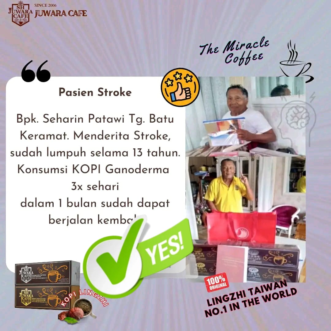 Formulasi Selama 4 Tahun:Proses formulasi selama 4 tahun menegaskan kehati-hatian dalam menggabungkan kopi dengan LingZhi, menunjukkan komitmen terhadap pengembangan produk yang optimal.Mengandung Yungkien LingZhi dari Taiwan: JUWARA Kopi merupakan satu-satunya jenis kopi yang mengandung Yungkien LingZhi dari Taiwan. Ini memberikan nilai terapi yang berpotensi membantu dalam proses penyembuhan berbagai penyakit.Biji Kopi 100% Brazil Arabika & Krimer dari VCO Belanda: Kombinasi biji kopi 100% Arabika dari Brazil dan krimer dari VCO Belanda memberikan citarasa yang lembut dan nikmat sekali. Selain itu, JUWARA Kopi juga bebas dari lemak trans, sehingga aman untuk kesehatan jantung.Dengan JUWARA Kopi, Anda mendapatkan manfaat kesehatan, kenikmatan rasa, dan yang tak kalah penting, harga yang terjangkau.